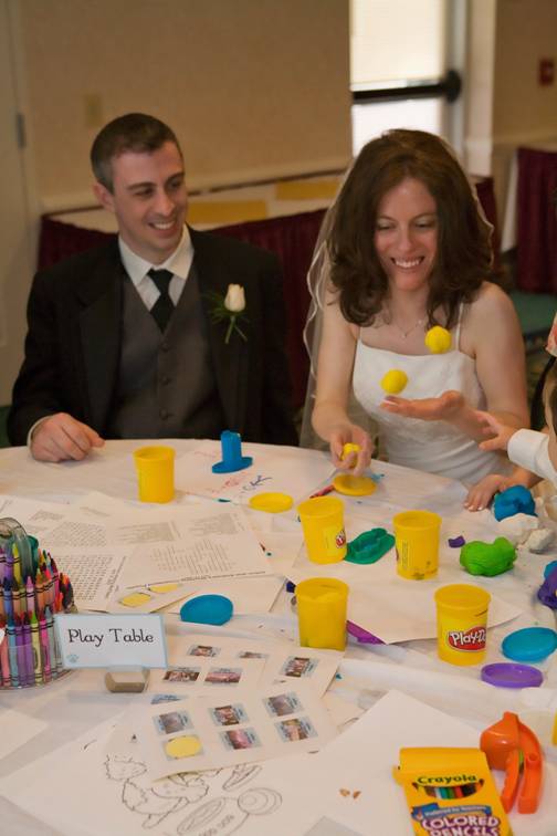 A photo of me juggling Play-doh at the “Play Table” at our wedding
